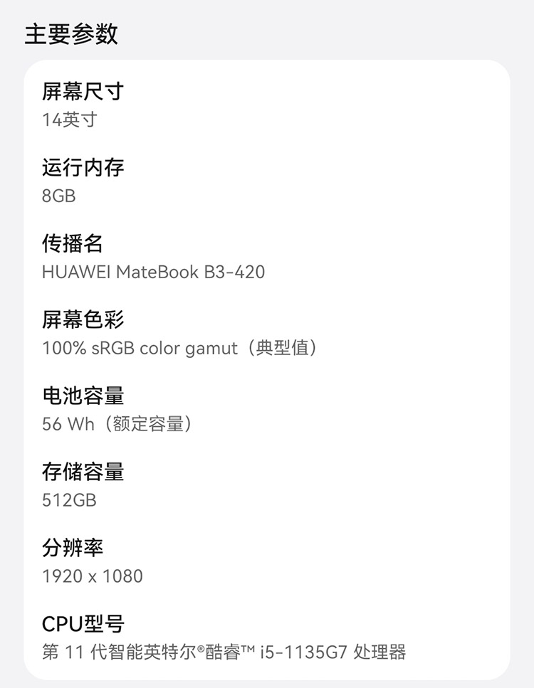 參數(shù) [品牌] 華為 [型號(hào)] MateBook B7-410 [毛重] 1.49Kg [單位] 臺(tái)