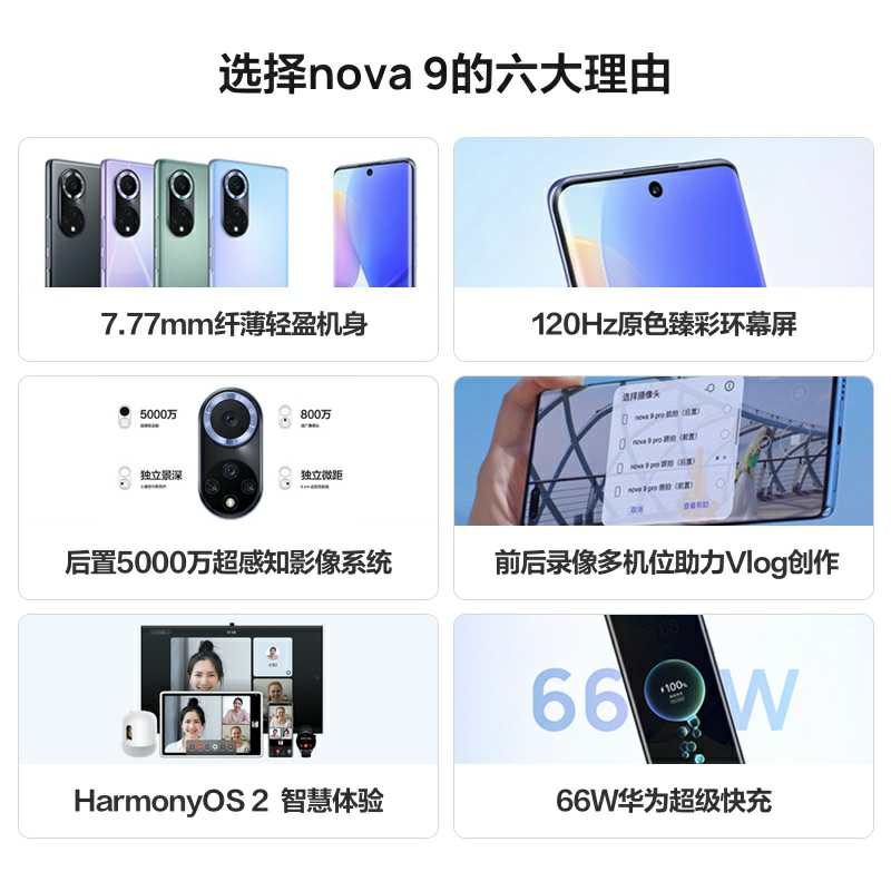規(guī)格參數(shù) 拍照功能 后置攝像頭 5000萬像素高清攝像頭 + 800萬像素超廣角攝像頭+ 200萬像素景深攝像頭+ 200萬像素微距攝像頭 攝像頭類型 后置四攝+前置單攝 顯示 分辨率 FHD+ 2340*1080 像素 屏幕尺寸 6.57英寸 網(wǎng)絡 網(wǎng)絡類型 4G 全網(wǎng)通 網(wǎng)絡模式 雙卡雙待 機身詳情 款式 直板 存儲 存儲容量 8+128GB 8+256GB 基本參數(shù) 品牌 Huawei/華為 華為型號 NOVA 9 CPU核心數(shù) 八核 機身顏色 9號色 普羅旺斯 綺境森林 亮黑色 手機類型 智能手機 操作系統(tǒng) HarmonyOS CPU品牌 高通
