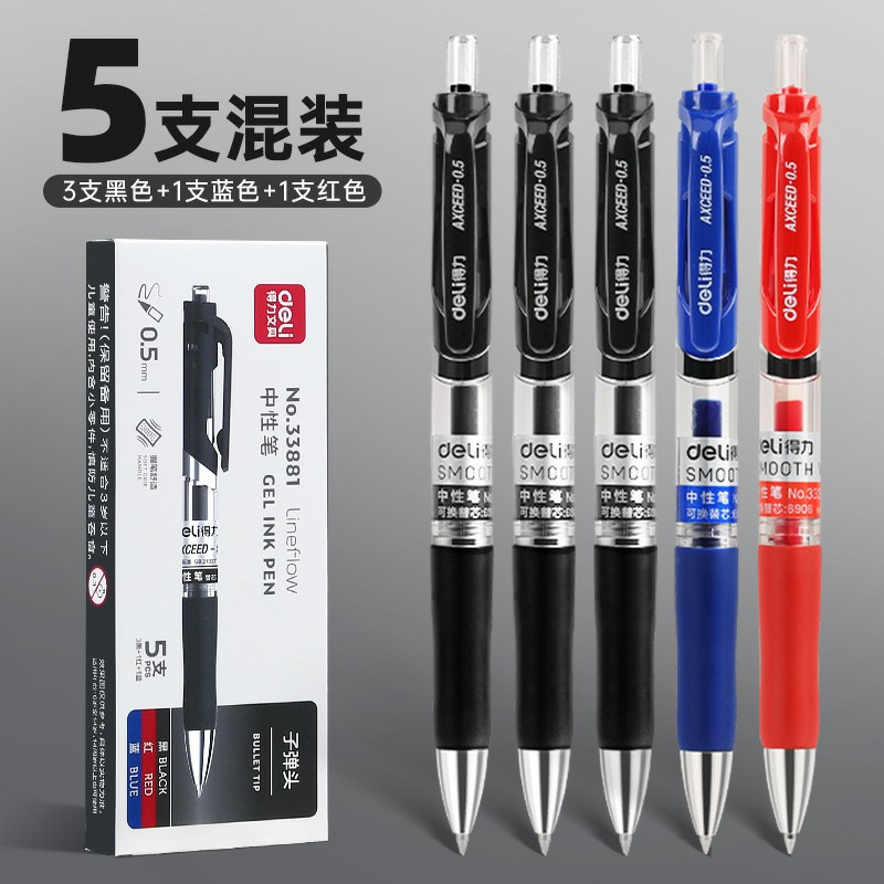 5支混裝-得力按動筆中性筆水筆學生用考試按壓式子彈頭碳素黑色水性簽字筆芯05mm圓珠筆藍黑紅筆教師辦公文具用品