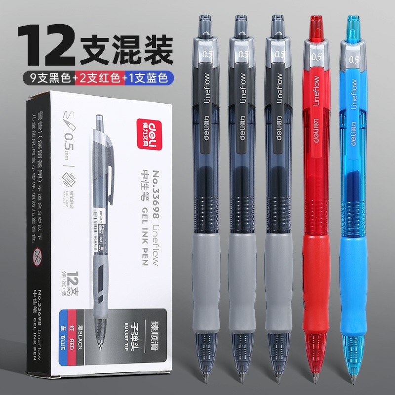 12支混裝-得力按動筆中性筆水筆學(xué)生用考試按壓式子彈頭碳素黑色水性簽字筆芯05mm圓珠筆藍黑紅筆教師辦公文具用品