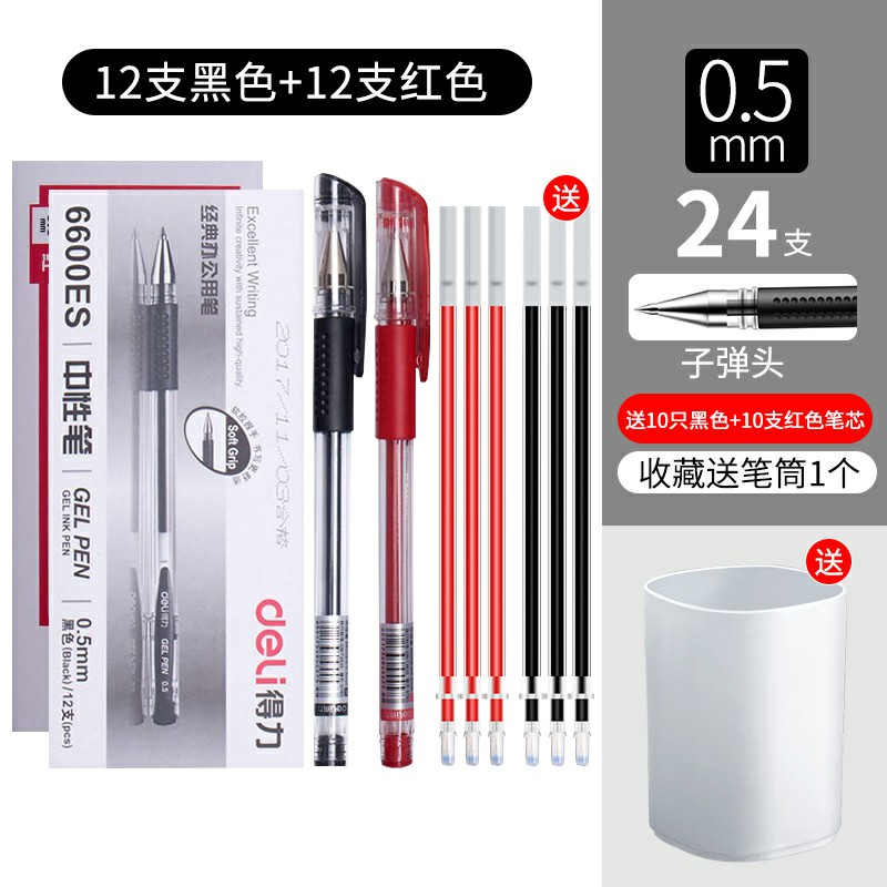 12支紅色+12支黑色-得力文具中性筆學(xué)生用黑色0.5mm子彈頭水筆藍(lán)紅簽字筆批改筆記賬筆辦公用品書寫工具碳素筆50/12支裝